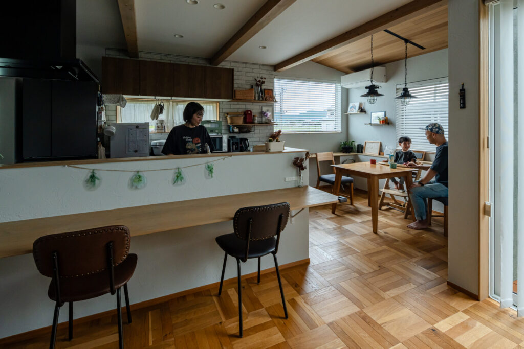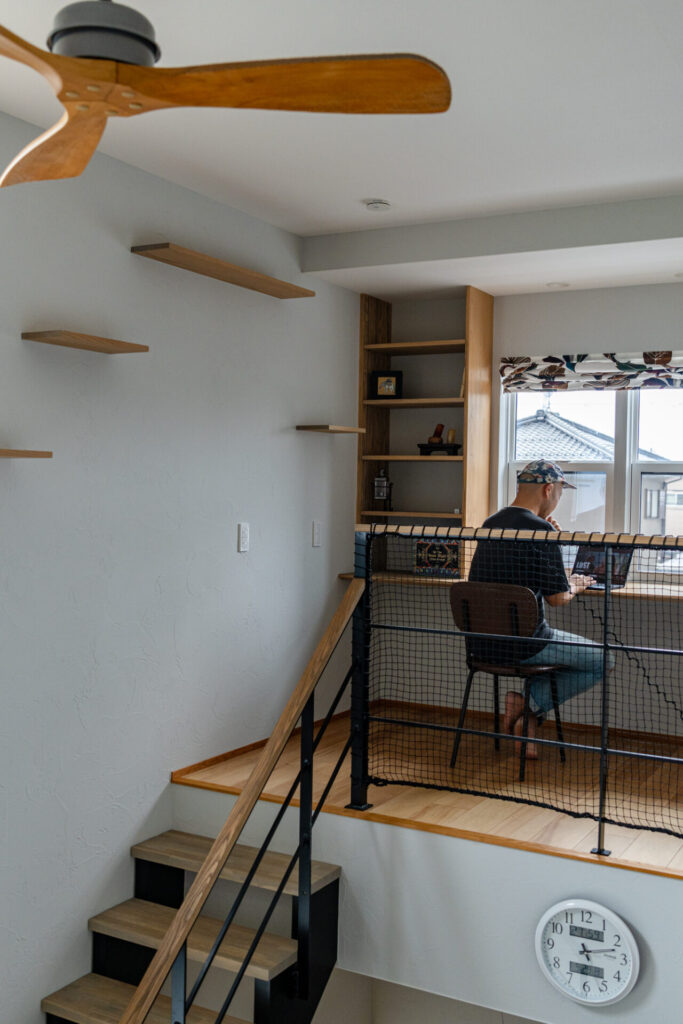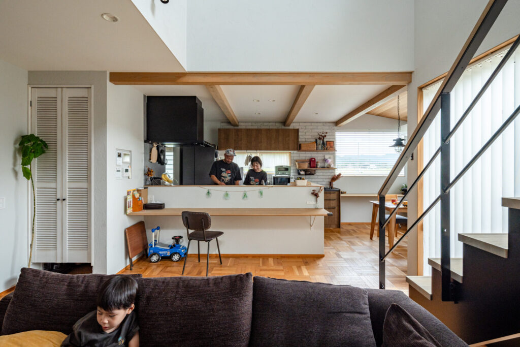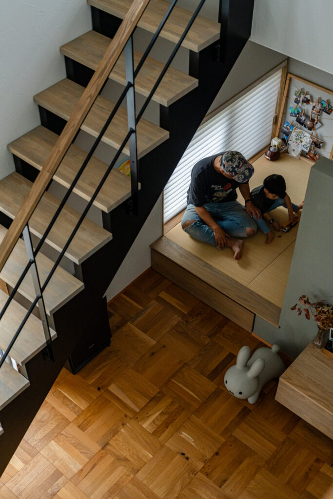 明るく賑やかなご夫婦の暮らしにふさわしい住まいを目指し、キッチンを起点に、家族の気配が届く空間を構成した。料理をしながら子どもたちの遊びや学びを見守れるように、スタディカウンターと小上がりの畳スペースをキッチンの正面にレイアウト。ダイニングの上には吹き抜けを設け、2階ホールにあるご主人の書斎とも、ゆるやかな視線のつながりを持たせた。将来家族に加わる猫のため、キャットウォークや専用スペースもしっかりと用意した。住むほどに経年変化を楽しめる素材を選び、家族の時間とともに住まいもゆっくりと味わいを深めていく。