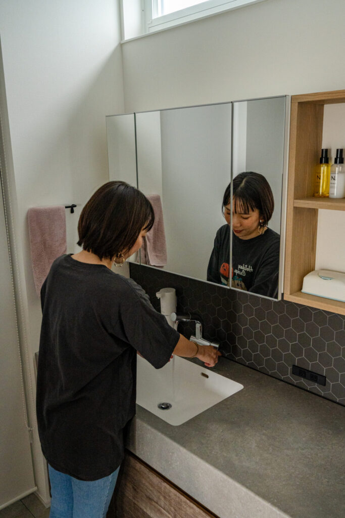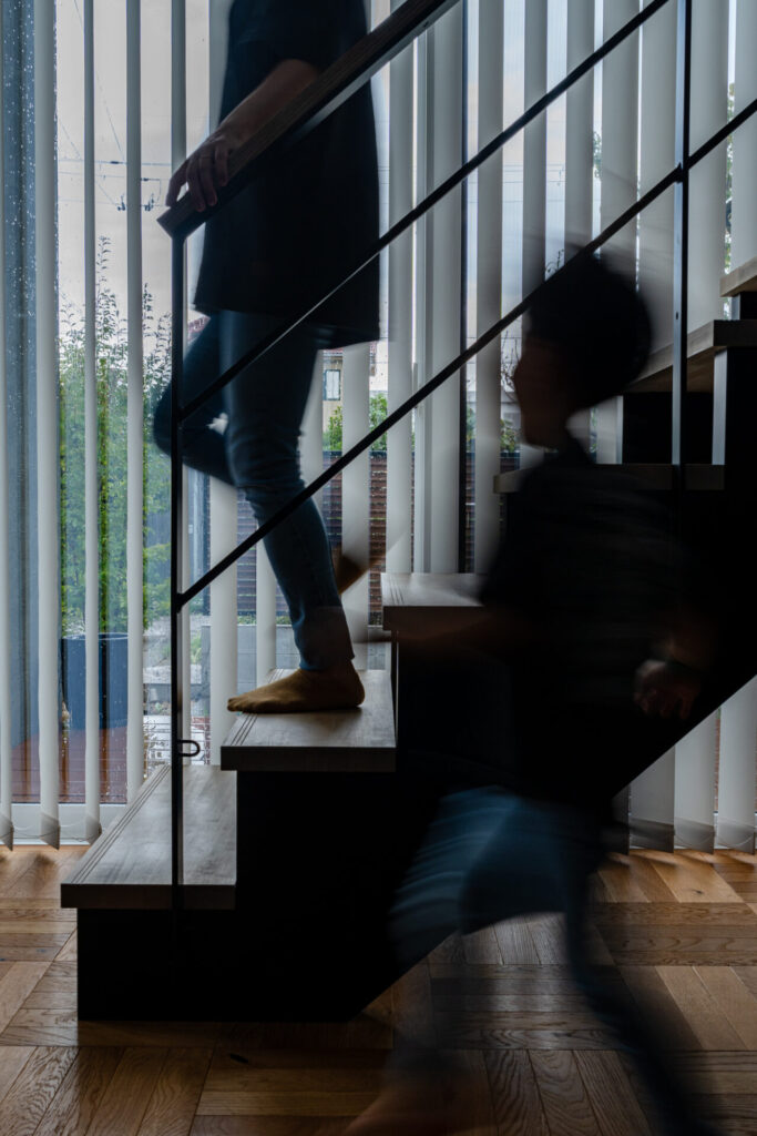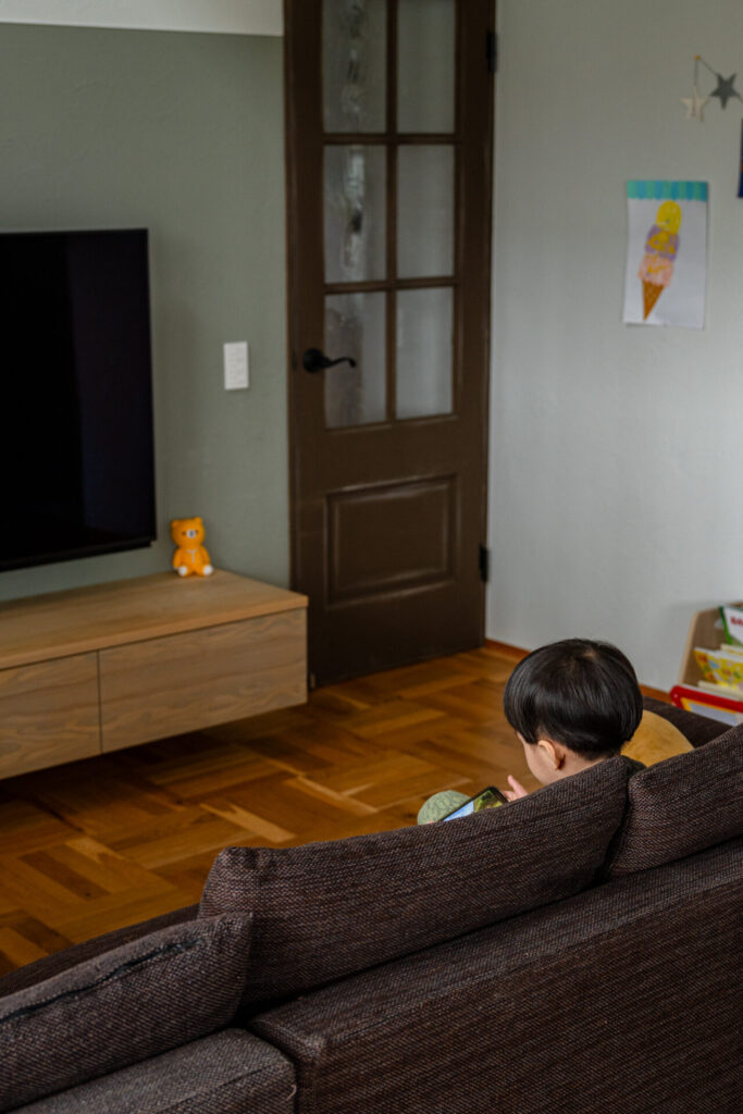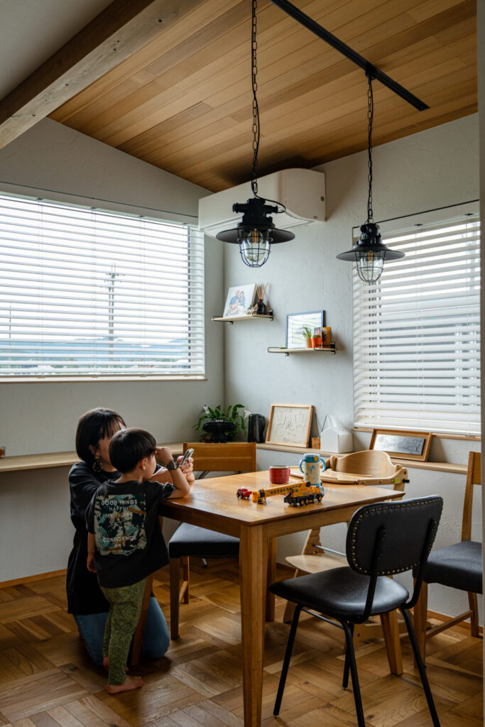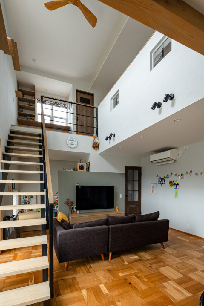 明るく賑やかなご夫婦の暮らしにふさわしい住まいを目指し、キッチンを起点に、家族の気配が届く空間を構成した。料理をしながら子どもたちの遊びや学びを見守れるように、スタディカウンターと小上がりの畳スペースをキッチンの正面にレイアウト。ダイニングの上には吹き抜けを設け、2階ホールにあるご主人の書斎とも、ゆるやかな視線のつながりを持たせた。将来家族に加わる猫のため、キャットウォークや専用スペースもしっかりと用意した。住むほどに経年変化を楽しめる素材を選び、家族の時間とともに住まいもゆっくりと味わいを深めていく。