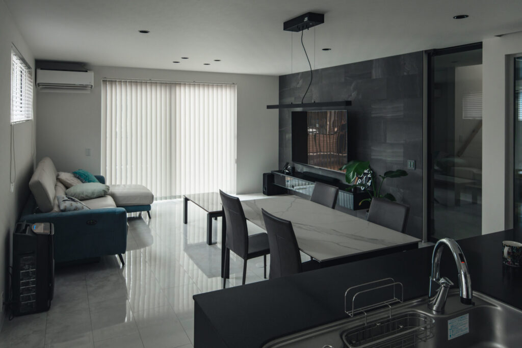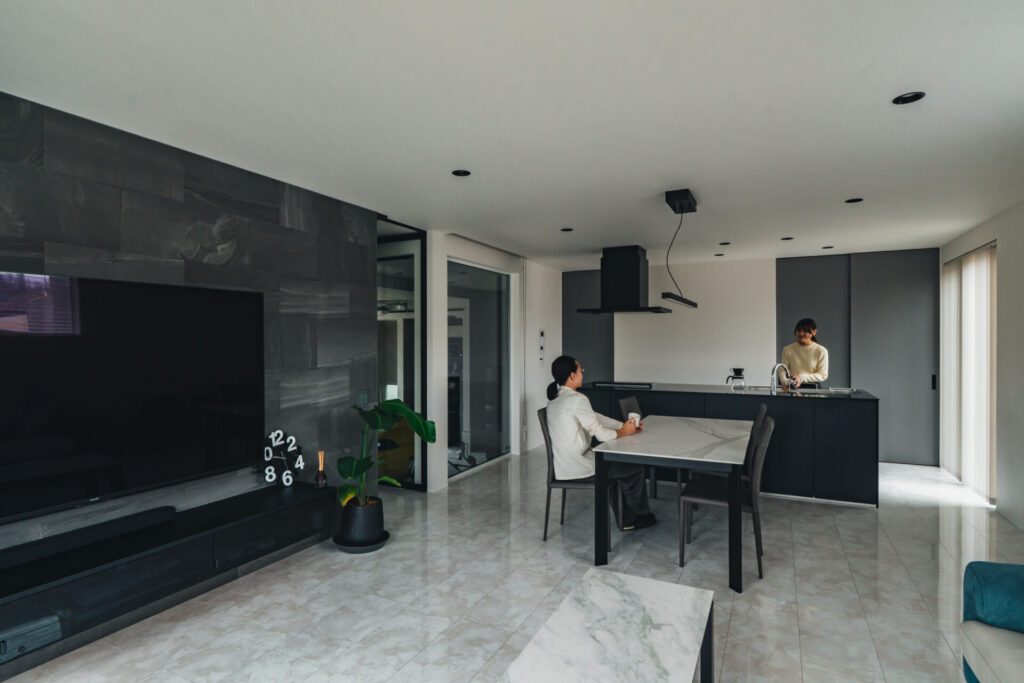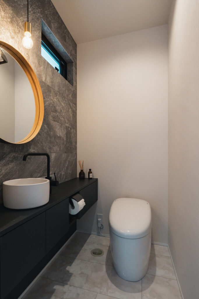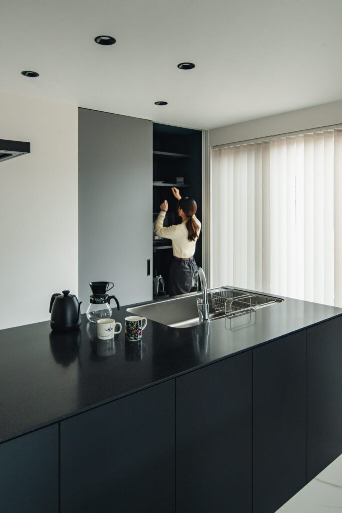木の素材感を控えた分、タイルや石目の陰影が際立ち、大人のかっこよさが静かににじみ出る。